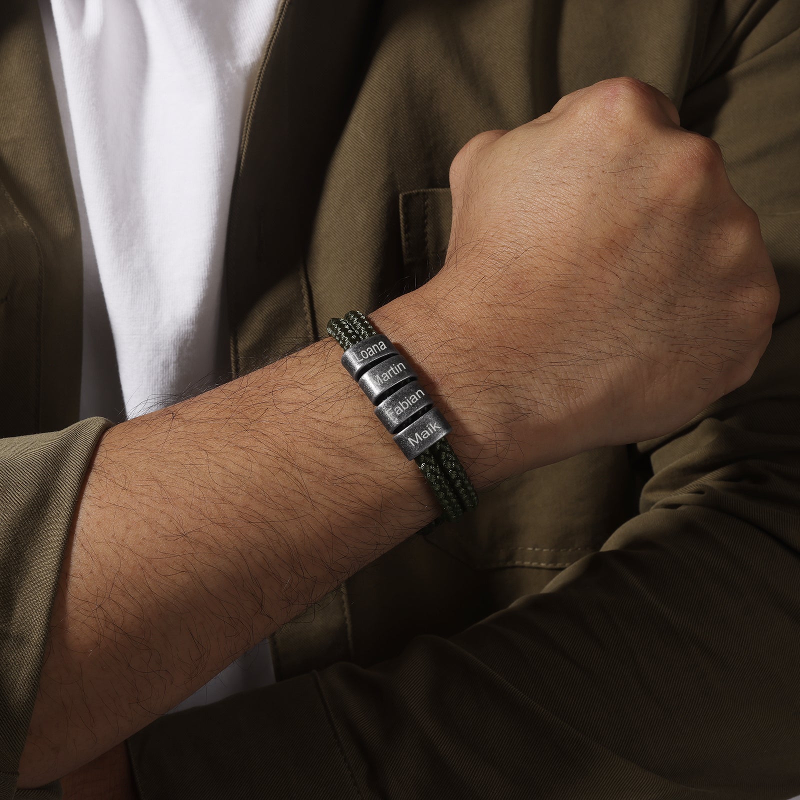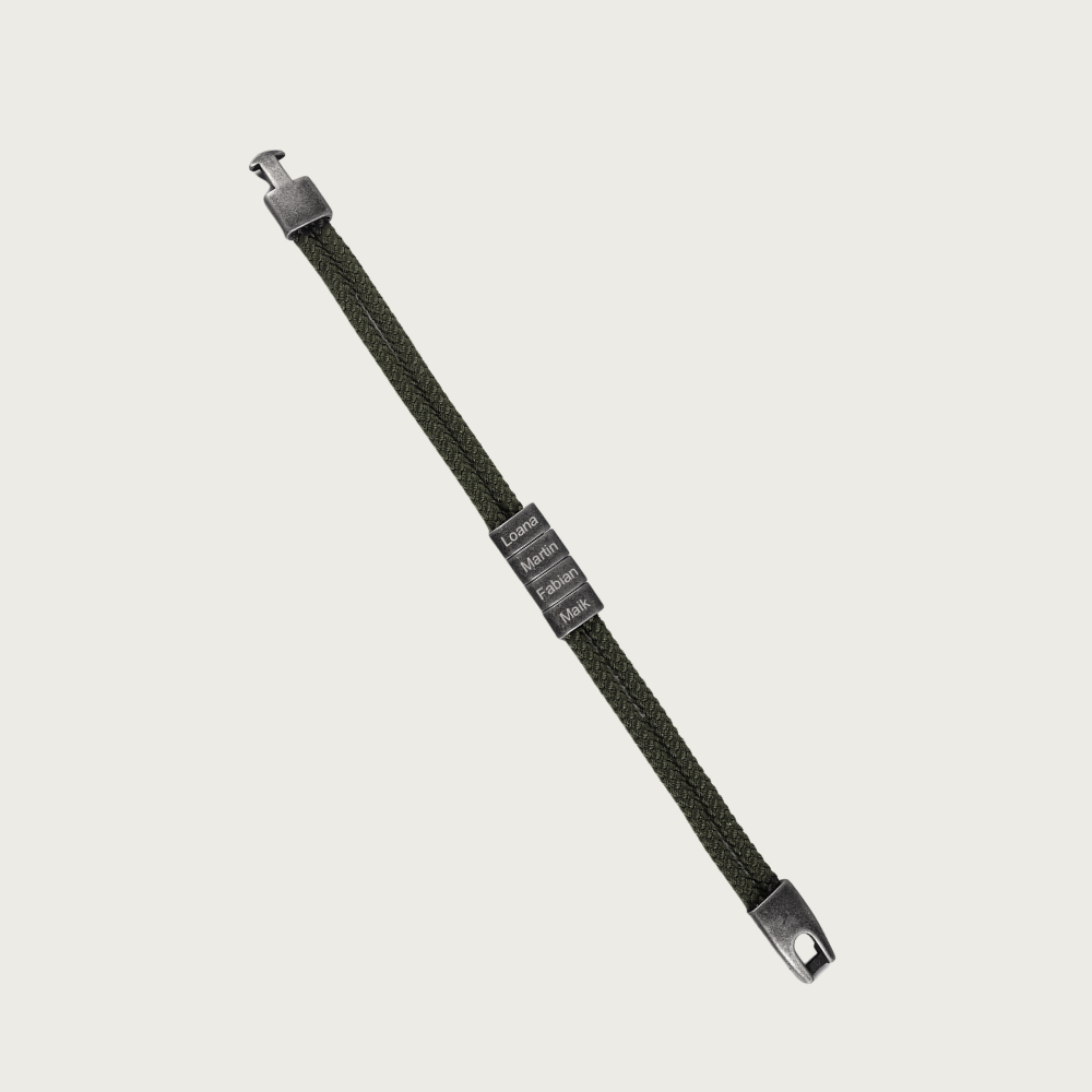 A combination of bold and fatherhood is what this bracelet represents. There are many bracelets available, but none as unique as this one. The two sturdy straps are held together by engraved rings, which you can personalize with names and/or dates.